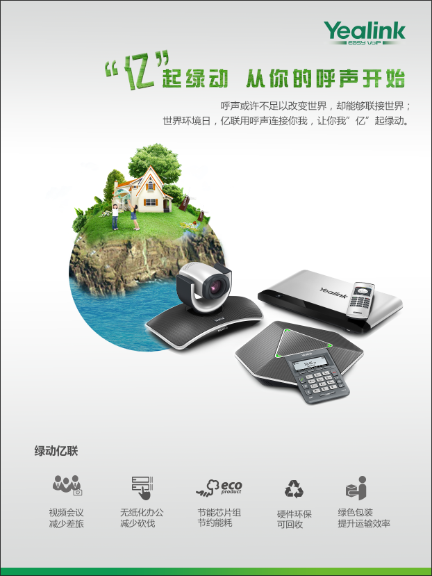 6月5日是世界環(huán)境日,聯(lián)合國(guó)環(huán)境規(guī)劃署將今年主題確定為“提高你的呼聲,而不是海平面”。作為全球TOP3的IP話機(jī)提供商,億聯(lián)再次積極響應(yīng)世界環(huán)境日,發(fā)起“‘億’起綠動(dòng),從你的呼聲開(kāi)始”為主題的公益環(huán)�;顒�(dòng),倡導(dǎo)“綠色”溝通,號(hào)召行業(yè)和企業(yè)從自身做起,為環(huán)保事業(yè)貢獻(xiàn)一份力量。